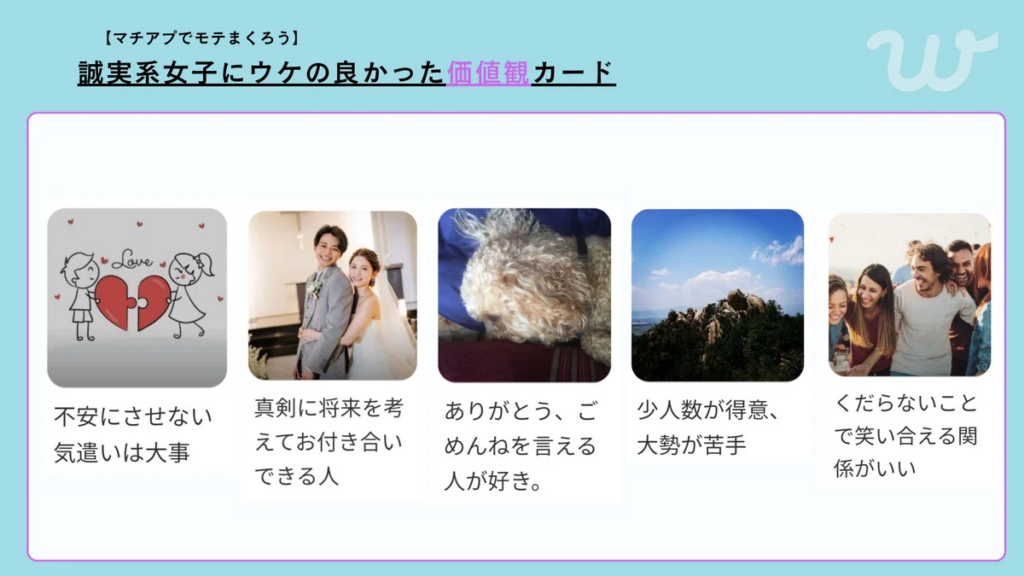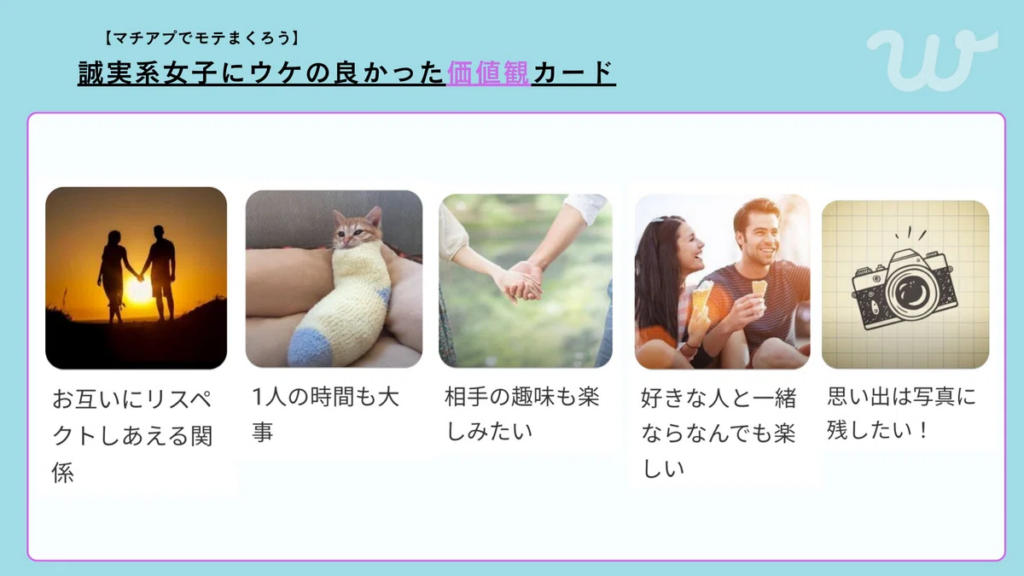 共通の価値観や穏やかな趣味に関連するカードは、誠実さを感じさせる効果があるといえます。