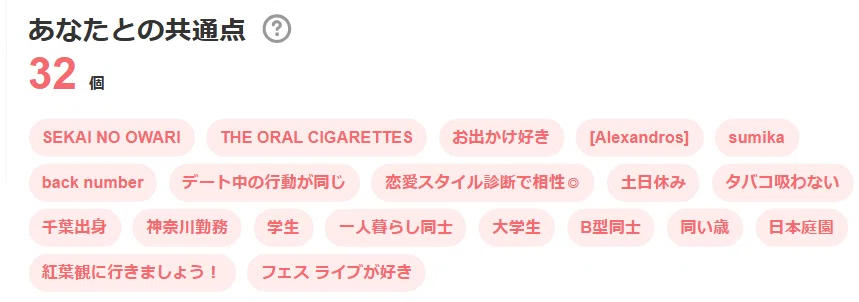 しかし、女性とのマッチングの際には「あなたとの共通点 ○個」といった表示が出てくるため、多く登録しておけば、共通点が増えるチャンスが上がるので、メリットしかありません!🙂