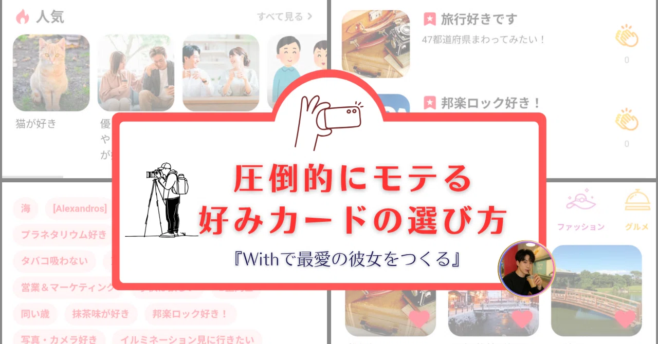 今回は、withやペアーズなどのマッチングアプリで「プロフィール」の次に大切になってくる「趣味・価値観カード」の使い方について、具体例も交えながら解説していきます。